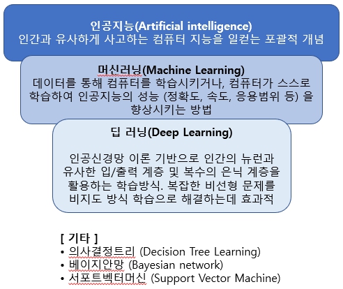 딥러닝의 개념 딥러닝(Deep Learning)이란, 인간 뇌의 학습 처리 과정을 모방한 머신러닝의 한 종류로 사람의 사고방식을 컴퓨터에게 가르치는 것을 의미한다. 다시 말해, 데이터를 군집화하거나 분류하는데 사용되는 방법론으로써 하나의 데이터를 입력해주면 컴퓨터가 스스로 학습하면서 비슷한 데이터들의 패턴을 찾아내어 분류하는 방식을 의미한다. 또한, 데이터를 분류하는 기계학습 알고리즘들은 현재에도 많이 활용되고 있으며, 대표적으로는 의사결정나무, 베이지안망, 서포트벡터머신(SVM), 인공신경망 알고리즘을 들 수 있다. 이 중에서도 딥러닝은 인공신경망(ANN) 알고리즘을 기반으로 입력 계층(Input Layer)과 출력 계층(Output Layer) 사이에 복수의 은닉 계층(Hidden Layer)이 존재..