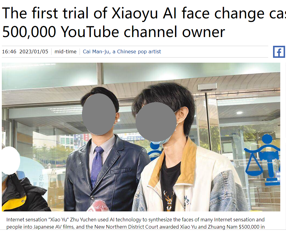 딥페이크 포르노 영상 제작자, 피해자에게 NT$50,000 지불 명령(01/05/2023)