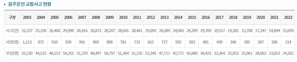 경찰통계자료를 찾아봤다. 작년 한해 음주운전으로 인한 사건사고는 22년말 기준으로 15,059건이 발생하였고 이중 사망자는 214명, 부상자는 24,261명에 달하는 것으로 파악되었다.