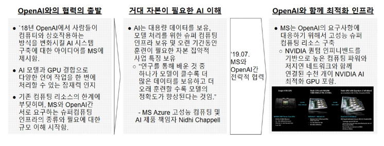 하지만 기존 컴퓨팅 자원으로는 한계를 느끼고, 이로 인해 MS와 오픈AI간 필요한 슈퍼 컴퓨팅 자원의 필요성을 이해했다고 한다. 즉 거대 자본이 필요하다는 것을 서로 인지하게 되어, 자본과 자원의 MS와 능력의 오픈AI간 2019년 전략적 협력을 맺게 되었다고 한다. 그 이후 꾸준히 MS는 언어모델 등 AI 최적화 IaaS를 구축하면서 오픈AI 또는 생성형AI의 든든한 IaaS 후원자 역할을 해 오고 있다.
