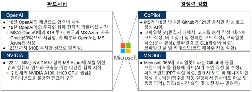 AI 반도체 분야에서 가장 강력한 엔비디아와도 2022년 11월부터 MS Azure에 AI를 위한 슈퍼 컴퓨터 인프라 구축을 위한 협력을 시작하는 등 업계 No.1과의 협업을 잘 이끌어 내고 있다. 내부적으로 MS는 2018년 인수한 깃허브Github를 통해 2021년 GPT를 활용한 자동 코드 생성 AI인 코파일럿을 출시하여 개발자들의 지지를 더 얻을 수 있었다.