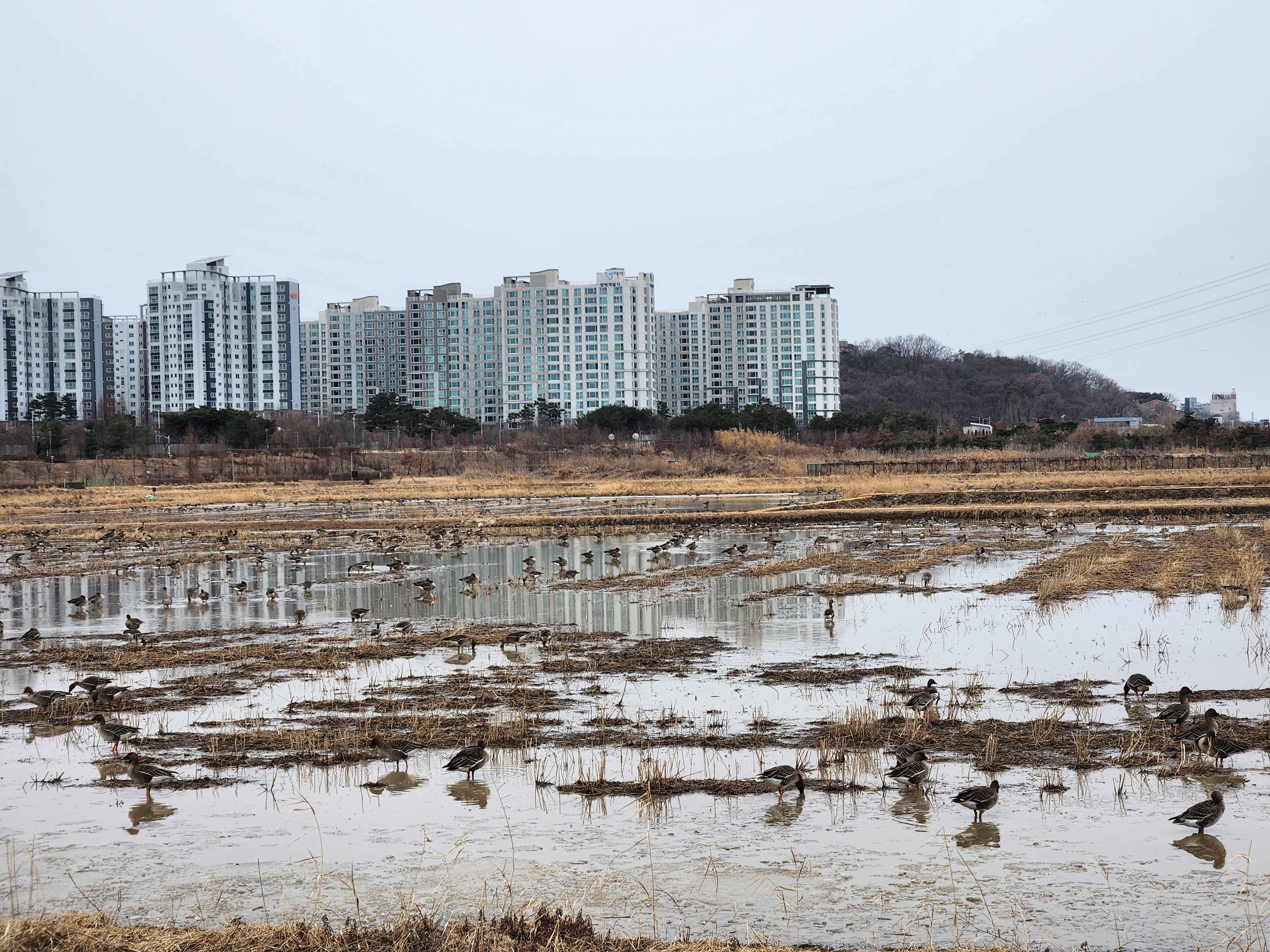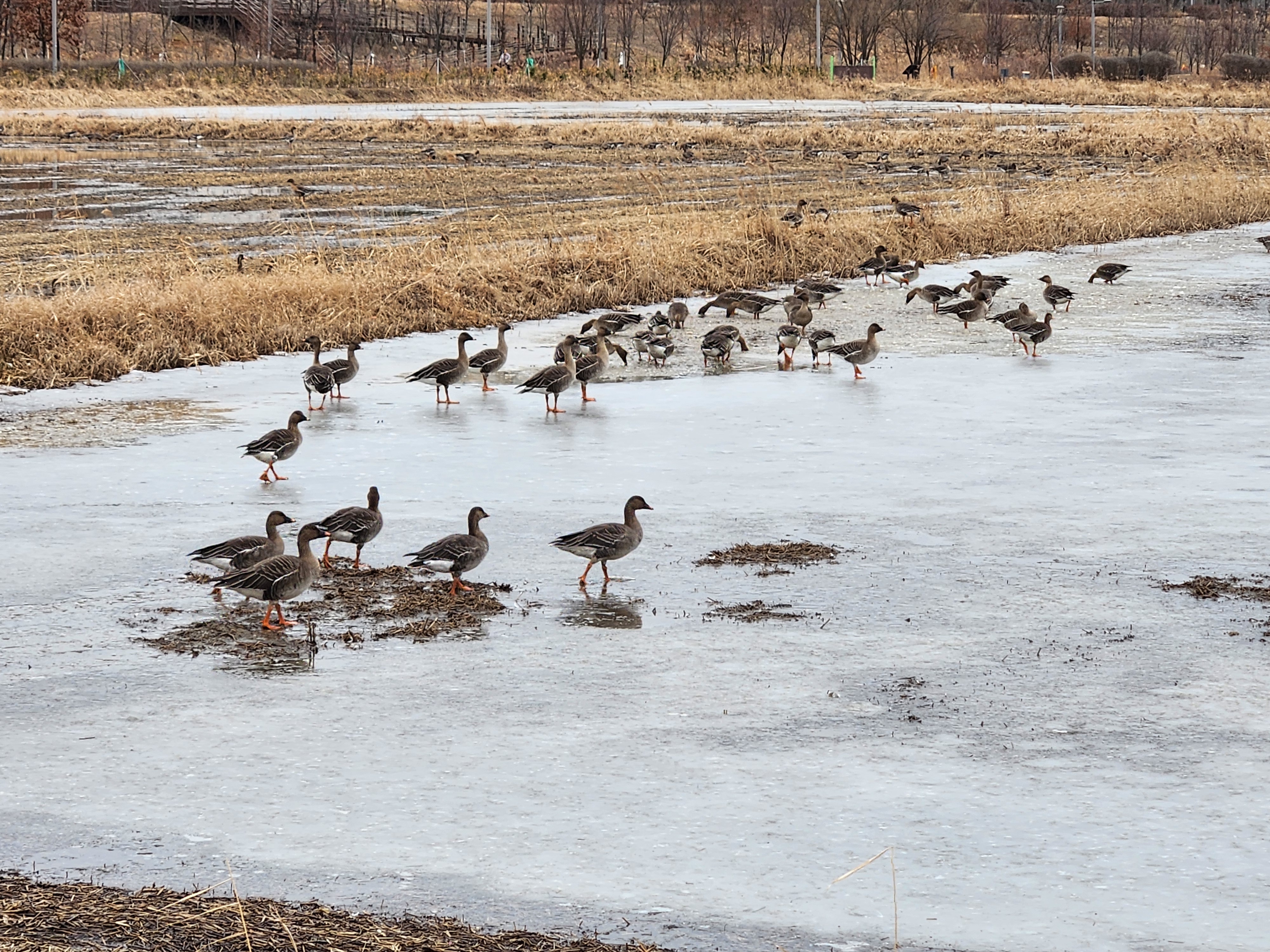한강변 아래쪽 논두렁에 이렇게 긴긴시간, 겨울을 보내며 유유히 계절나기를 하고 있는 철새들을 보게 된다. 삼삼오오 짝을 지어서 무리들이 이동하며 먹이 먹는데 집중하는 모습들, 낯선 사람들에 대한 경계를 익숙한듯 심하지 않았다.