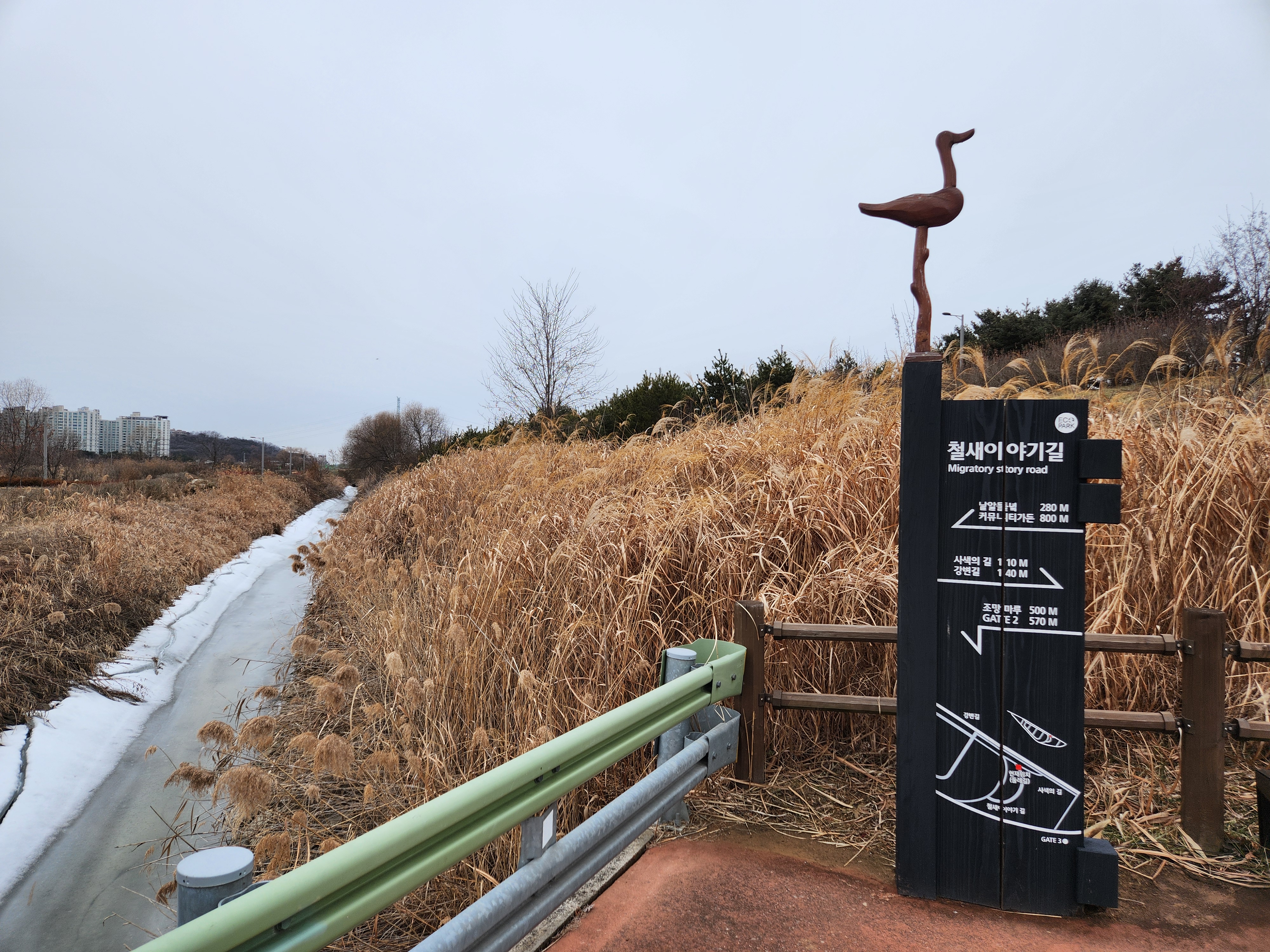 한강변 아침 겨울바람을 이기지 못하고 샛길로 내려와서 접한 이정표, 철새이야기길이랜다. 물도 얼고 억새들도 추워보였다. 이 길을 시작으로 아침일찍 식사를 하고 있는 겨울 철새들의 낯선 모습도 발견했던 철새도래지의 광활한 풍경을 훔쳐볼수 있었다.