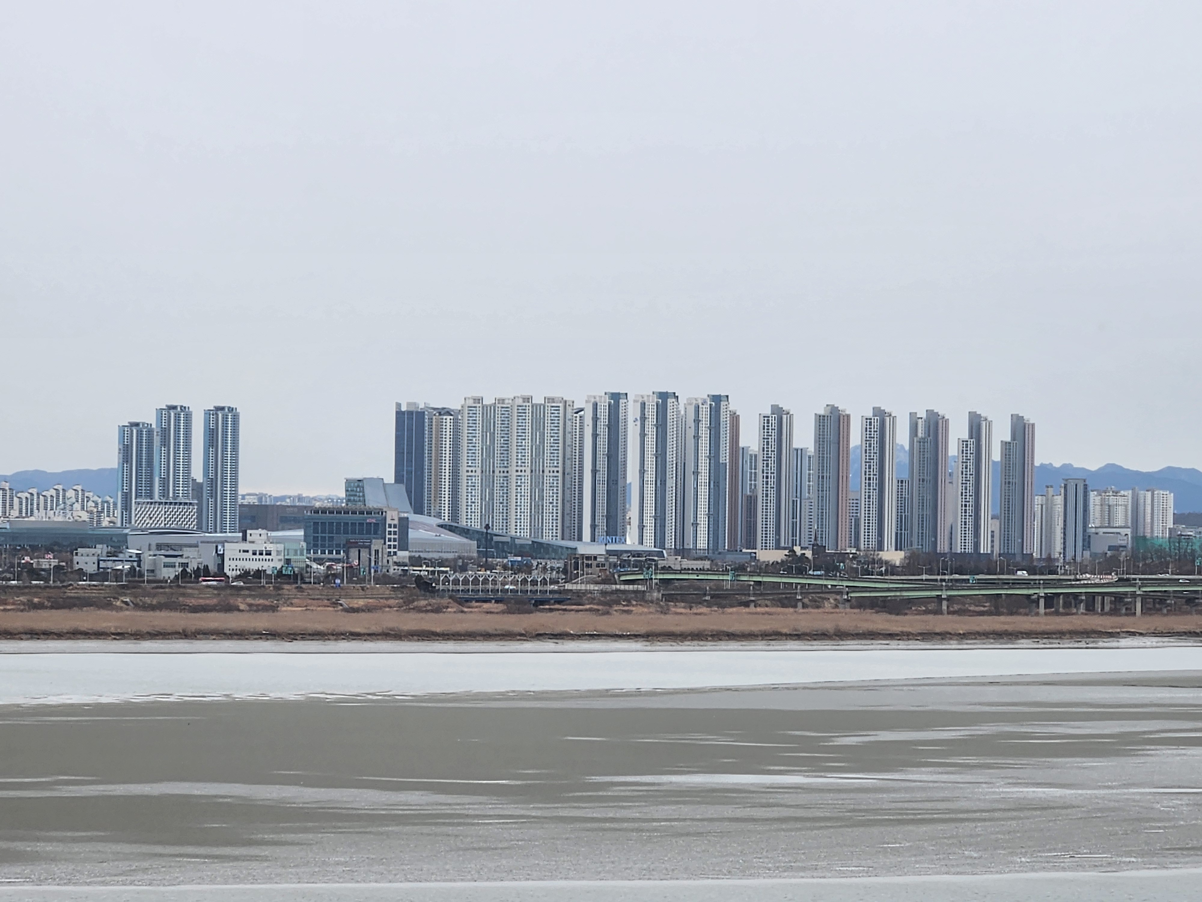 야생조류생태공원 전망대에 올라서 바라본 한강변 맞은편의 모습, 일산이다. 저기 아파트숲 뒤로는 북한산 언저리까지도 보여서 묘한 풍경화에 한참을 쳐다봤다. 이쪽은 내가 아는 동넨간, 저쪽은 내가 가본 곳인가, 저긴 어디였더라..