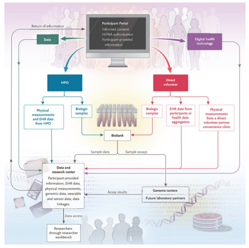 미국 국립보건원(NIH)에서 주도하에 백만명 코호트 구축을 위한 프로그램 마련, 전자건강기록(EMR), 신체 계측 정보, 생체 시료 수집 및 참가자 개인정보(PPI) 등을 연계하여 데이터를 수집하고 있으며, 수집된 빅데이터를 통해 건강과 질병에 미치는 영향을 탐구하고 정밀의학을 발전시키기 위한 프로젝트를 추진하고 있다.