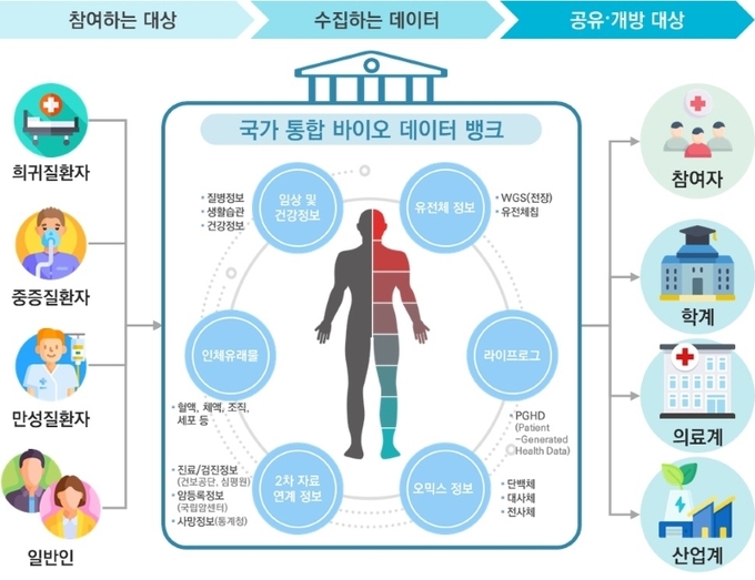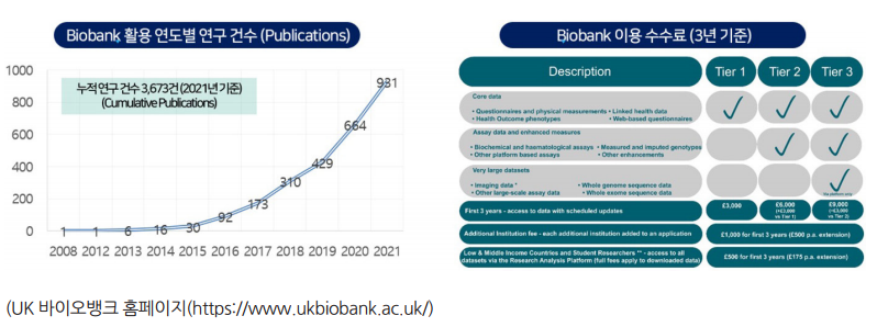 영국의 UK 바이오뱅크(Biobank), 정부와 WELLCOME TRUST(자선단체) 합작 투자로 시작하였으며, 영국 국민을 대상으로 건 강정보, 생활양식, 활동량, 심장・뇌 스캔, 채혈, 유전자 정보 등 광범위한 헬스케어 데이터를 수 집하고 저장하는 거대한 생명자원 보관소 혁신연구플랫폼(RAP)을 통해 세계에서 가장 크고 포괄적인 11페타바이트 데이터베이스에 접근해 자유롭게 데이터 운영을 할 수 있다.