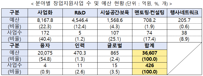 • 사업유형별 : 사업화(172개), 시설-보육(107개), 행사-네트워크(38개), 멘토링(74개), 글로벌(15개), 인력(11개) 기술개발(5개), 융자(4개) 순