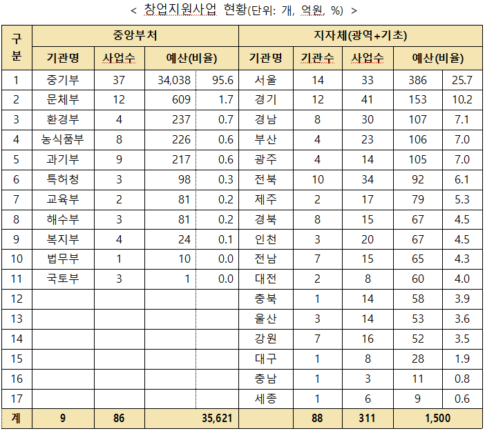 - : 융자‧보증(2조 546억원, 7개), 사업화(7,931억원, 166개), 기술개발(5,442억원, 6개), 시설·공간·보육(1,341억원, 98개), 글로벌 진출(1,138억원, 23개) 등으로 구성