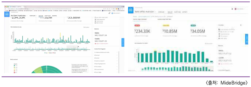 이에 영국 회계감사원은 정부 클라우드(G-Cloud)를 통해 캐나다 기업 Mindbridge의 AI 기반 감사 시스템을 '18년에 도입하였다. Mindbridge의 회계 감사 시스템은 재무상 비정상적인 재무 패턴을 발견하고 위험도가 높은 거래를 탐지 가능하였고, 회계 데이터의 패턴을 학습해 잠재적인 위험을 식별하고, 이를 예방하기 위한 인사이트를 제안하는 예측 기능을 제공하기도 하였다.