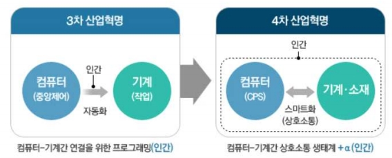 여기에 맞춰 인간의 역할 또한 크게 변화합니다. 3차 산업혁명에서 인간은 제어를 담당하는 컴퓨터와 생산·물류 등 단일 작업을 하는 기계를 프로그래밍(소프트웨어)을 통해 밀접하게 연계시켜 생산의 자동화를 이끌어냈습니다. 그러나 4차 산업혁명에서 인간은 컴퓨터와 기계간 연결의 바깥에 위치합니다.